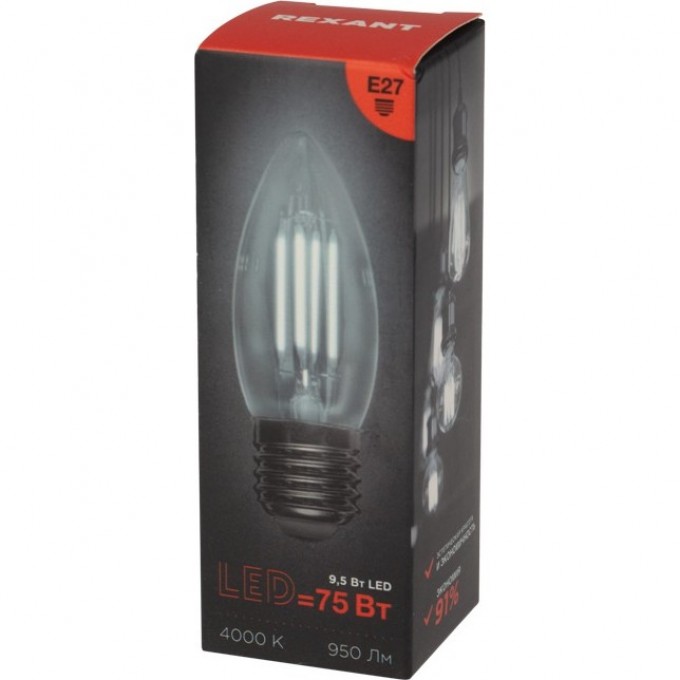 Лампа филаментная REXANT СВЕЧА CN35 9,5Вт 950Лм 4000K E27 прозрачная колба 604-094