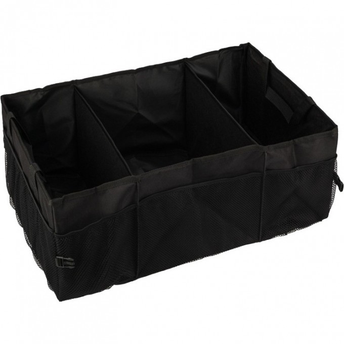 Универсальный органайзер в багажник автомобиля размером 60х39х26 см и объемом 65 л. Предназначен для обеспечения порядка в багажнике автомобиля. Для предотвращения скольжения по багажнику на дне органайзера предусмотрены липучки. Органайзер оснащен тремя раздельными карманами внутри изделия. На внешней части изделия также расположено 9 карманов для хранения необходимых мелочей. Для удобства хранения органайзера в сложенном виде предусмотрены пластиковые зажимы.