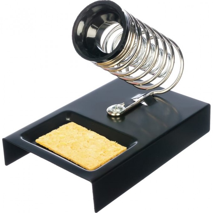 Выполнена из витой хромированной конусообразной пружины и металлической платформы с ложементом под губку для очистки жала паяльника от остатков припоя. Губка для очистки жала паяльника в комплекте.