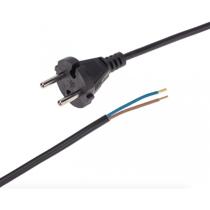 Провод ПВС сечением 2х0,75 мм² номинальным током 10 А с подготовленными (зачищенными) контактами укомплектован литой неразборной плоской вилкой (Евро).